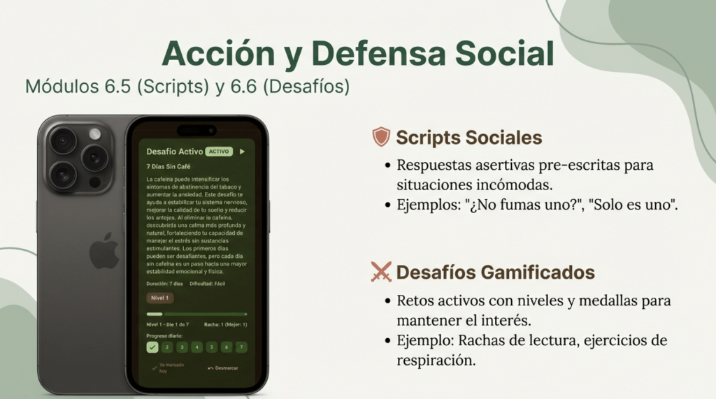 Retos gamificados con objetivos claros y logros alcanzables que refuerzan hábitos positivos. Sistema de niveles, puntos y recompensas para mantener tu racha y celebrar cada día sin fumar.