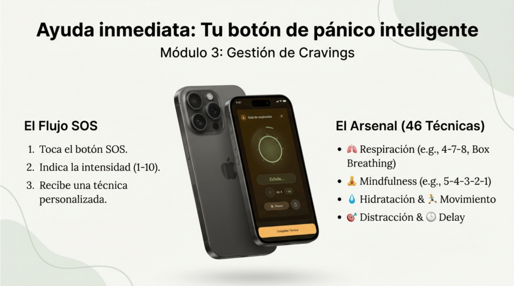 Cuando sientas un antojo fuerte, activa el botón SOS y recibe técnicas inmediatas con timer integrado para superarlo.