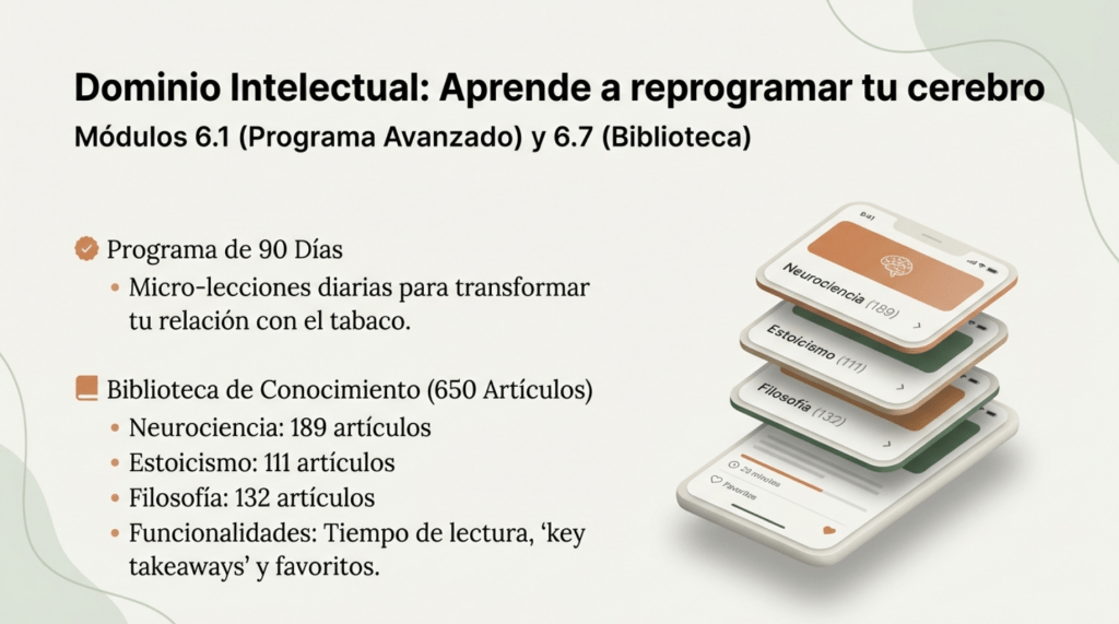 650 artículos educativos basados en evidencia científica sobre neurociencia, estoicismo, filosofía y técnicas. Con búsqueda avanzada, favoritos y tiempo de lectura estimado para entender cada fase del proceso.