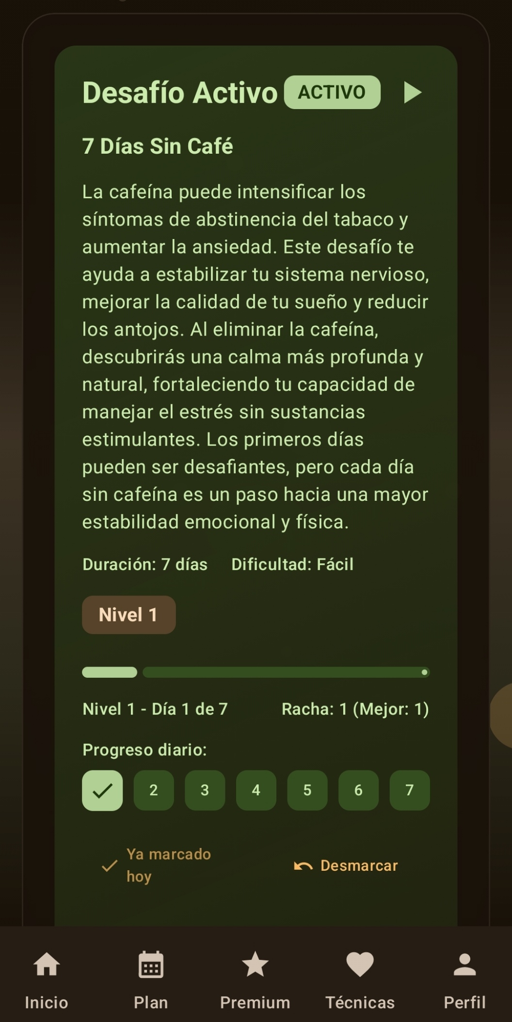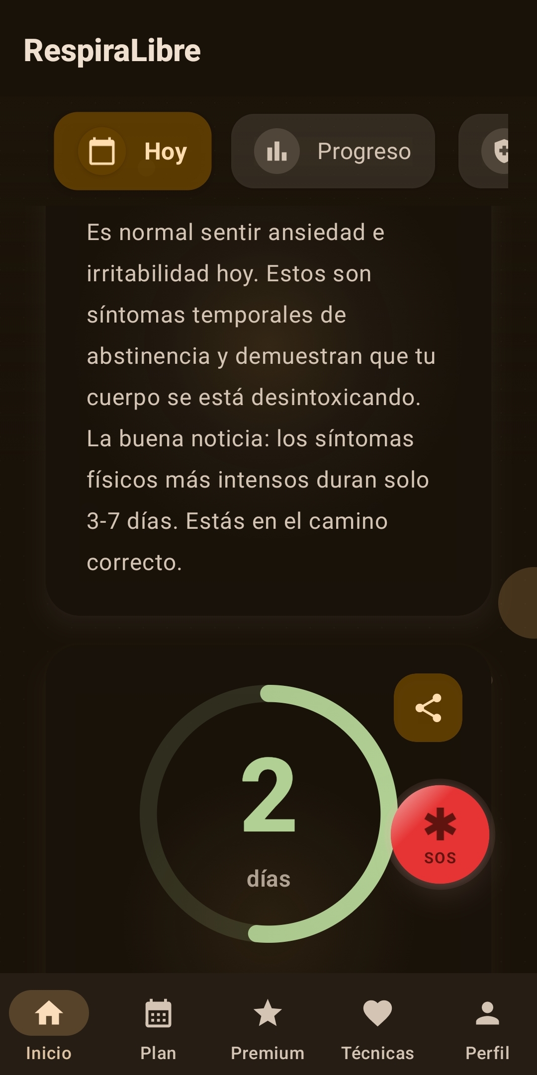 Cuando sientas un antojo fuerte, activa el botón SOS y recibe técnicas inmediatas con timer integrado para superarlo.